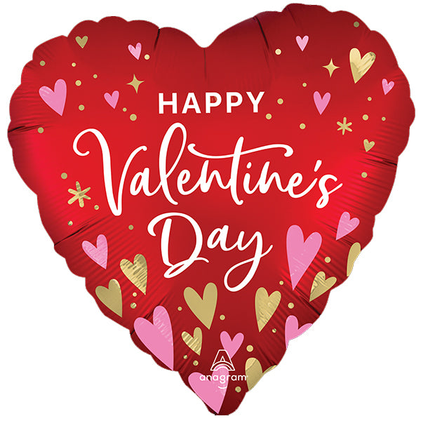 A red heart shaped balloon with white text 'Happy Valentine's Day' surrounded by gold and pink hearts.